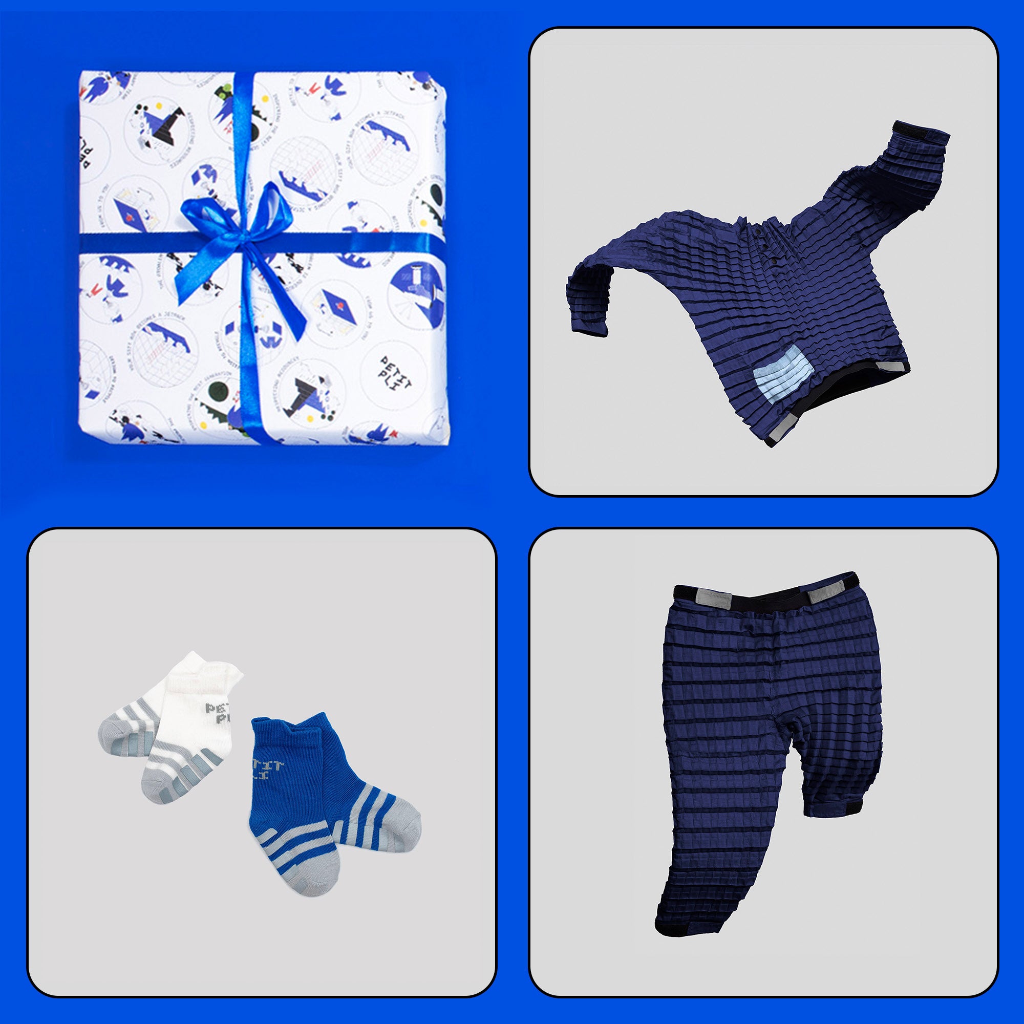 This bundle is perfect for landing into the Petit Pli universe. Featuring an Off-Cut Mascot made from excess fabric from our supply chain; vacuum sealed moon-boot socks with a silicone base for grip; our award-winning jetpack gift box; stickers; woven badge; and gift wrapping.