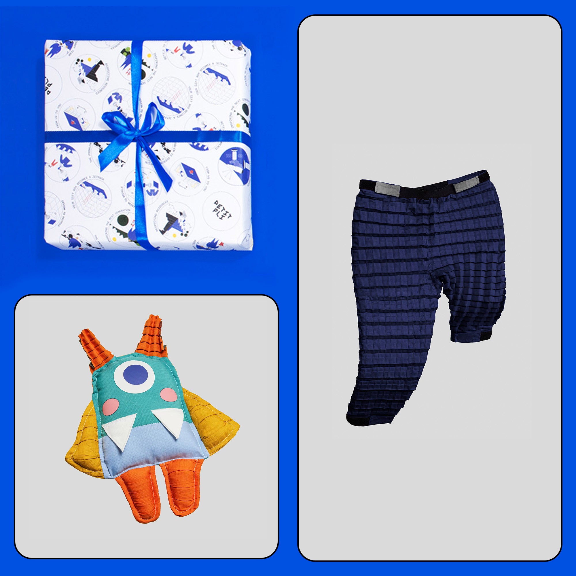 This bundle is perfect for landing into the Petit Pli universe. Featuring an Off-Cut Mascot made from excess fabric from our supply chain; our versatile bottoms best-seller; the award-winning jetpack gift box; stickers; woven badge; and gift wrapping.